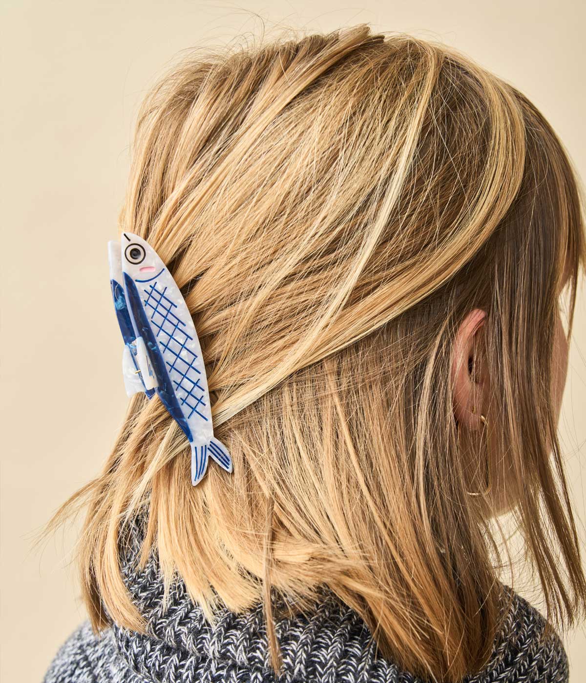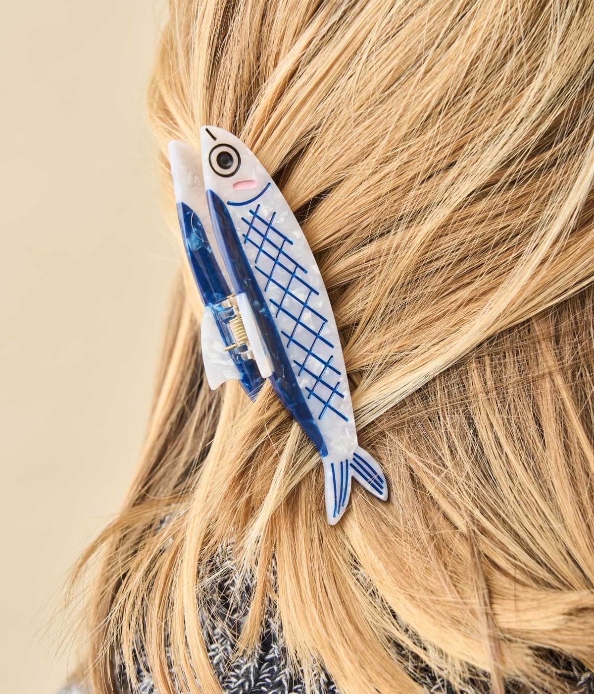 This cute little blue and white Anchovy hair claw is made from cellulose acetate, a plant-based alternative to plastic - the perfect stocking filler.