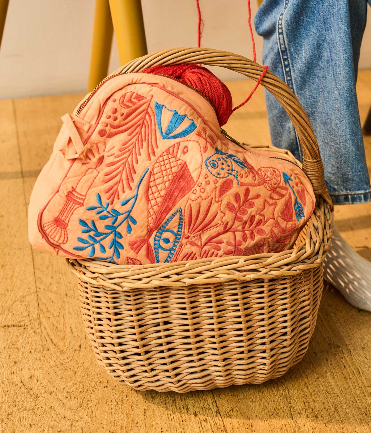 Choose from three unique styles, the Kiss styles are hand embroidered, with the salmon being a larger size. Perfect for storing all sorts of items, from toiletries to knitting.
